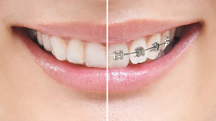 歯にブラケットと呼ばれる装置とワイヤーをつけて、歯やあごの骨に力をかけながらゆっくりと歯を動かし、歯並びを整えていく歯列矯正です。